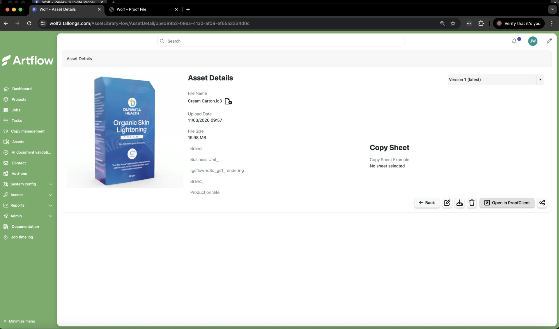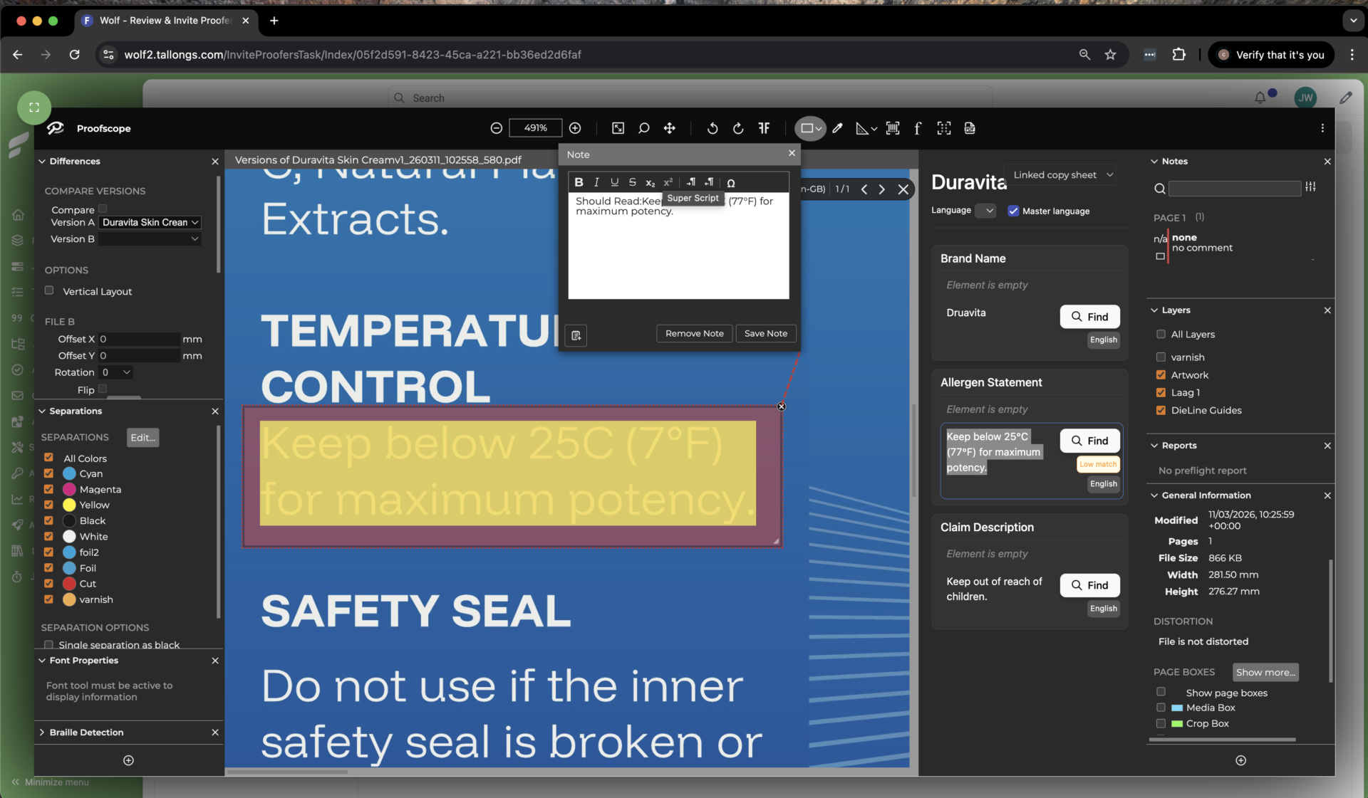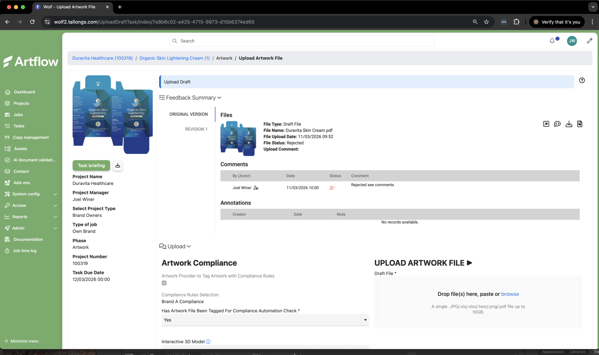 L’artwork del packaging caricato nella piattaforma SaaS di Artflow viene controllato automaticamente rispetto a regole di conformità integrate, aiutando a identificare i problemi nelle prime fasi del flusso di lavoro.